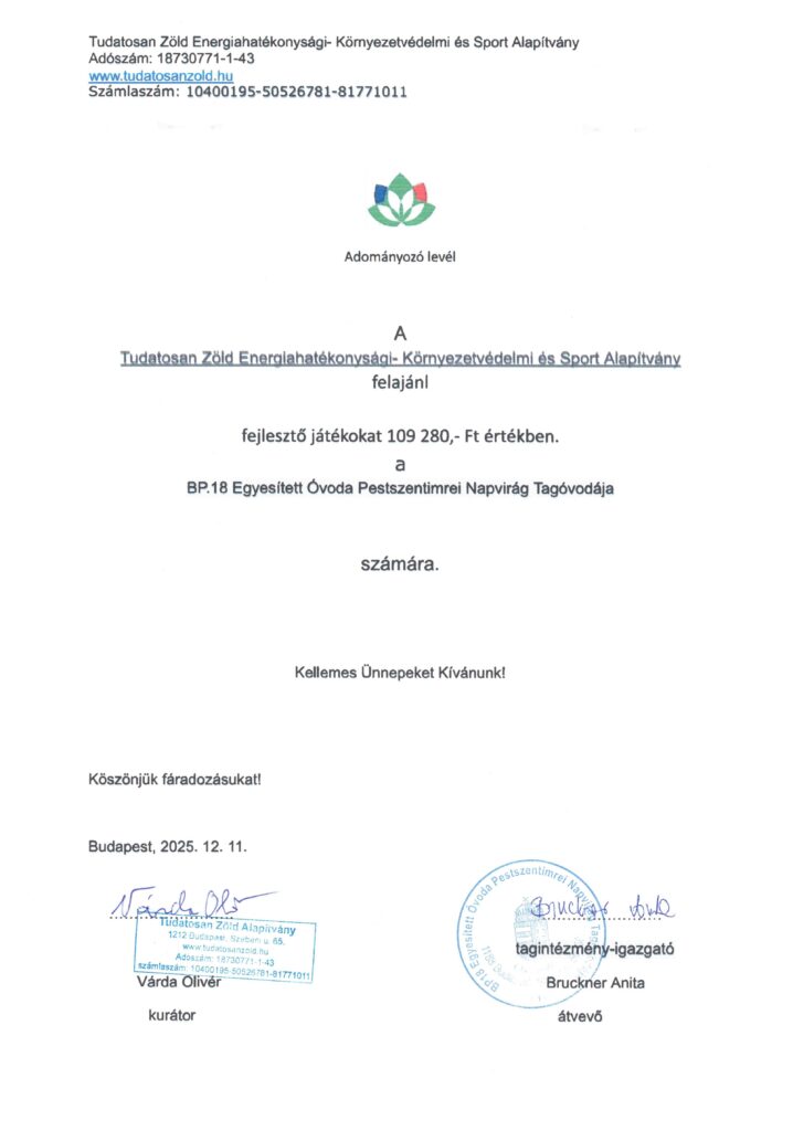 2025.12.11.-én a Budapest 18 Egyesített Óvoda Pestszentimrei Napvirág Tanovodája – részére adományoztunk mozgásfejlesztő játékokat, több mint 100.000Ft értékben.